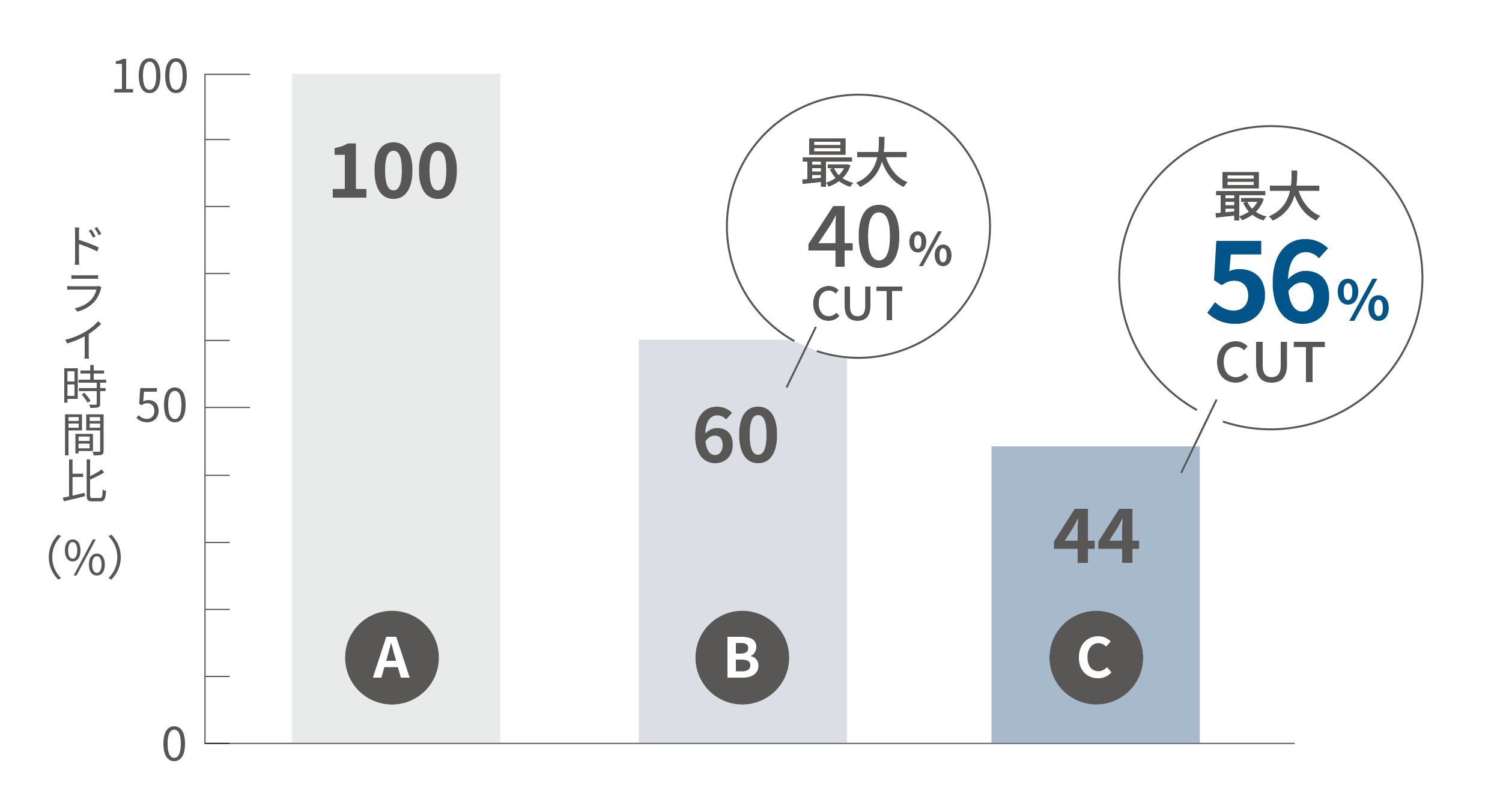 ※HIGH /100℃設定 ※Aを100%とした場合のドライ時間比較
