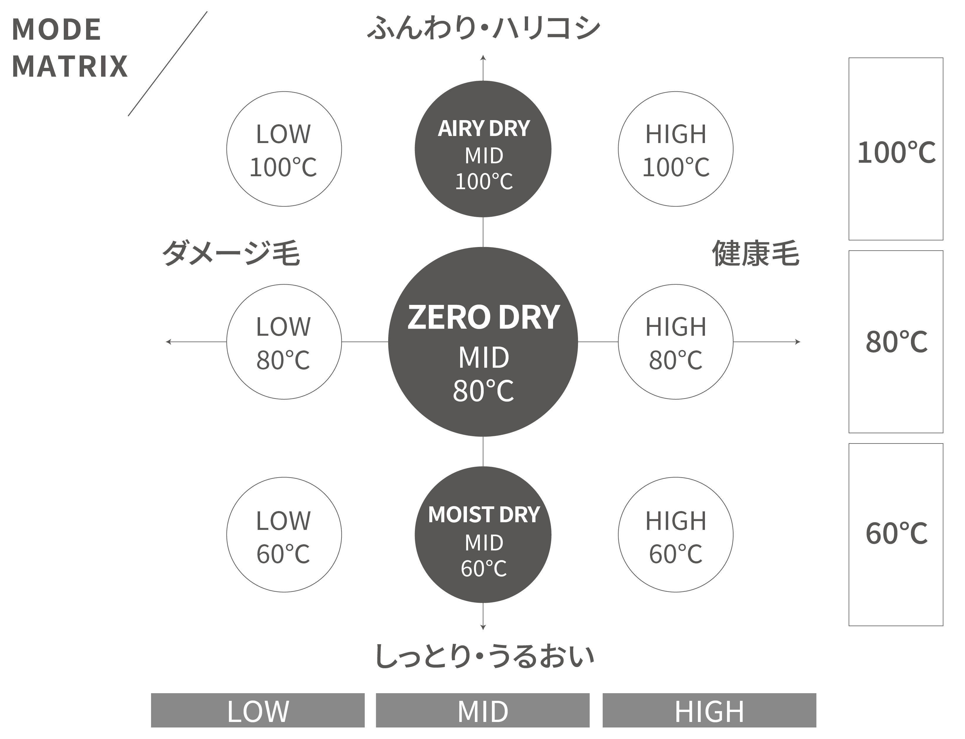 全体をMID 60℃で潤いを与えながら乾かし、ダメージで広がりやすい毛先はLOW 60℃でキューティクルまでケアしながらしなやかでツヤのある髪へ。